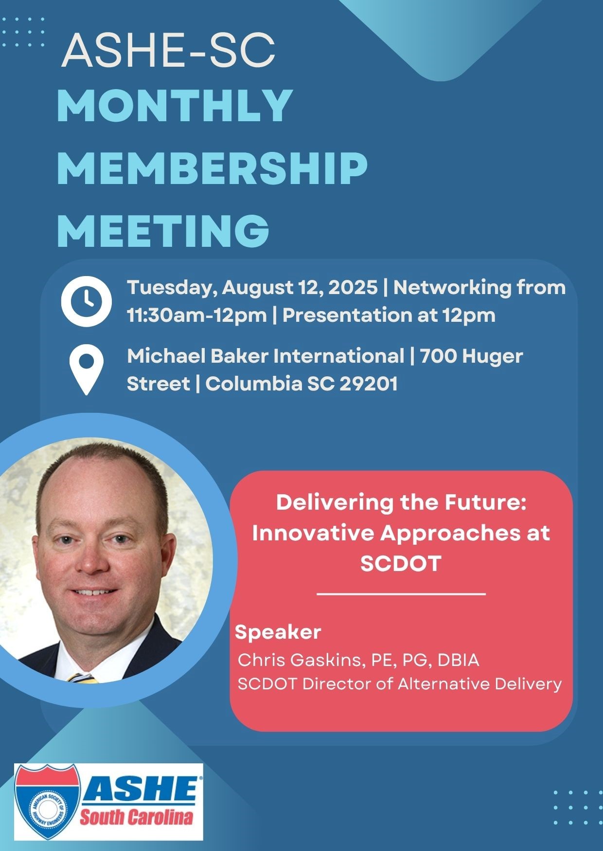 Please join us on Tuesday, August 12, 2025 for networking starting at 11:30AM and a presentation at noon by SCDOT’s Director of Alternative Delivery Chris Gaskins, PE, PG, DBIA, CPM, for a presentation on “Delivering the Future: Innovative Approaches at SCDOT”. Lunch will be provided. Details below.