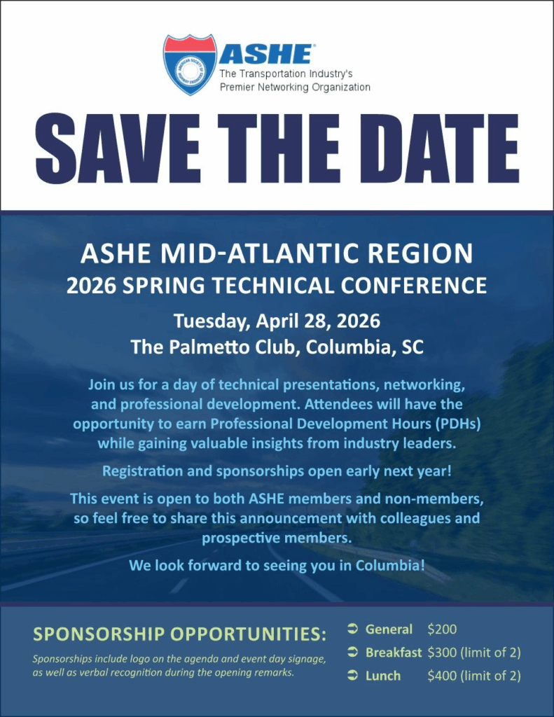 WTS SC and ASHE SC are partnering with ACEC-SC to host a reception the evening prior to the ACEC-SC/SCDOT Annual Meeting. All ASHE SC Section members are invited to attend for FREE (you do not Read more…